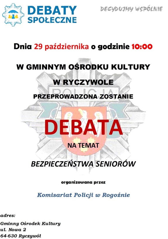 Komendant Powiatowy Policji w Obornikach zaprasza mieszkańców na debatę społeczną dotyczącą bezpieczeństwa seniorów. Spotkanie odbędzie się w Ryczywole. Serdecznie zapraszamy!