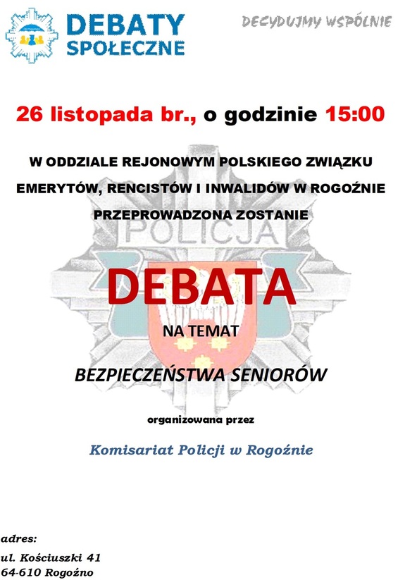 Komendant Powiatowy Policji w Obornikach zaprasza mieszkańców na debatę społeczną dotyczącą bezpieczeństwa seniorów. Spotkanie odbędzie się w Rogoźnie. Serdecznie zapraszamy!