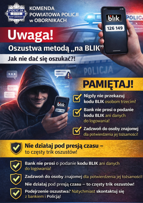 Od początku 2026 roku na terenie powiatu obornickiego doszło do dwóch oszustw, w których sprawcy wykorzystali metodę „na BLIK”. W obu przypadkach przestępcy, podszywając się pod zaufane osoby lub pracowników banku, doprowadzili pokrzywdzonych do niekorzystnego rozporządzenia mieniem. Łączna kwota strat wyniosła 5 400 zł.