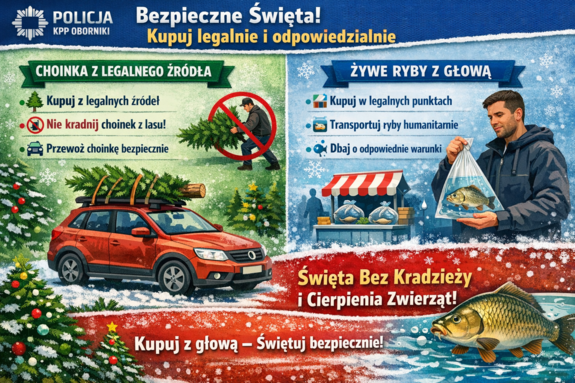 Okres przedświąteczny to czas zakupów i przygotowań do Bożego Narodzenia. Warto jednak pamiętać, że wybierając choinkę czy kupując żywe ryby na świąteczny stół, mamy obowiązek robić to legalnie, bezpiecznie i z poszanowaniem prawa oraz zwierząt. Komenda Powiatowa Policji w Obornikach przypomina najważniejsze zasady, o których nie wolno zapominać w przedświątecznym pośpiechu.