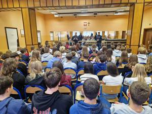 15 października br., oborniccy policjanci odwiedził uczniów Szkoły Podstawowej nr 2 w Obornikach. Podczas spotkania funkcjonariusze rozmawiali o bezpieczeństwie i wzajemnym szacunku do siebie, zwracali także uwagę na zagadnienia związane z zachowaniem się rówieśników, które mogą prowadzić do sytuacji niebezpiecznych. Podczas spotkania mundurowi informowali uczniów w jaki sposób powinni reagować w przypadku gdy są świadkami agresywnych zachowań oraz jak dbać o swoje bezpieczeństwo.