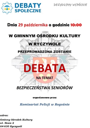 W Gminnym Ośrodku Kultury w Ryczywole odbyła się debata społeczna poświęcona bezpieczeństwu seniorów. Organizatorem spotkania był Komisariat Policji w Rogoźnie. W wydarzeniu uczestniczyli również przedstawiciele innych służb, w tym Powiatowego Inspektoratu Weterynarii oraz Państwowej Straży Pożarnej.